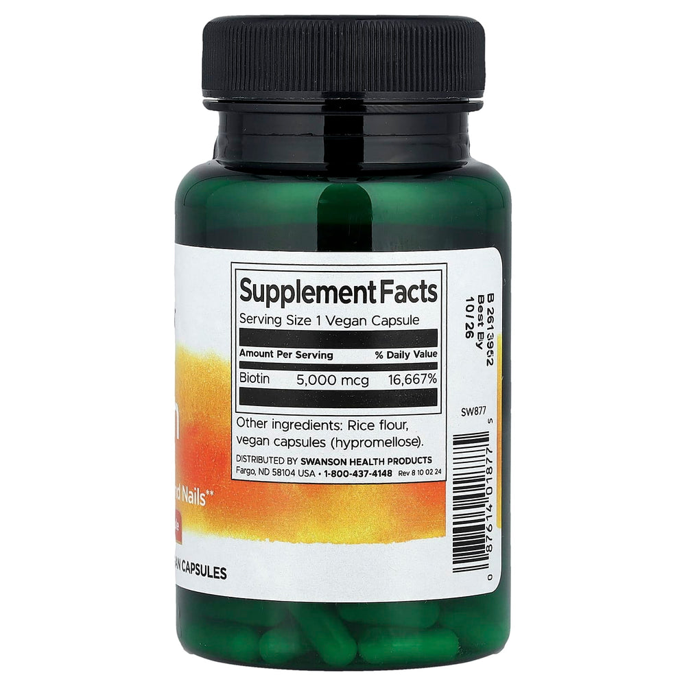Biotină (Vitamina B7) 5.000 mcg, Swanson este un supliment alimentar premium, formulat cu doza avansată de 5.000 mcg biotină (16.667% VNR) pentru susținere vizibilă a frumuseții și a metabolismului. Biotina, cunoscută și ca vitamina H sau B7, este un cofactor esențial pentru enzimele carboxilaze implicate în transformarea carbohidraților, grăsimilor și proteinelor în energie utilă. În același timp, joacă un rol central în sinteza keratinei, proteina structurală care conferă rezistență unghiilor, strălucire părului și elasticitate pielii. Formula de înaltă potență de la Swanson oferă suport intensiv pentru persoanele active, pentru cei care își doresc un aspect sănătos al părului/pielii/unghiilor sau pentru oricine caută o optimizare a metabolismului energetic de zi cu zi.