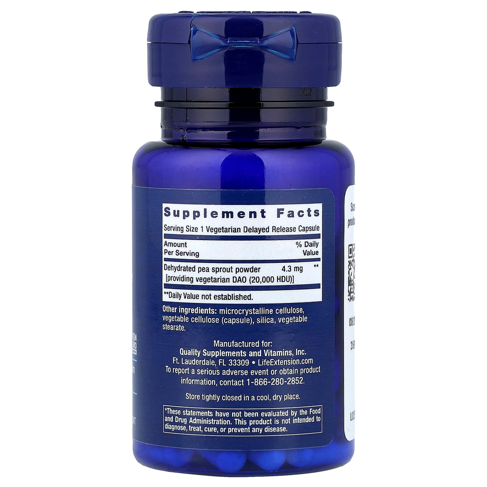 Food Sensitivity Relief with Diamine Oxidase (DAO), Life Extension este un supliment alimentar specializat, formulat pentru susținerea confortului digestiv și a toleranței alimentare, prin sprijinirea metabolismului histaminei la nivel intestinal. Produsul conține o sursă vegetariană de DAO (Diamine Oxidase) – enzimă cheie implicată în degradarea histaminei provenite din alimentație – obținută din pudră de germeni de mazăre deshidratați, standardizată la 20.000 HDU (unități de activitate DAO) per porție, într-o cantitate de 4,3 mg.