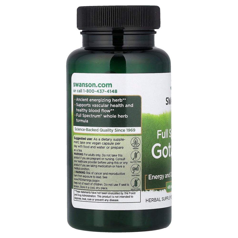 Cu Full Spectrum Gotu Kola, 435 mg, Swanson, beneficiezi de un fitonutrient clasic, într-o formulă modernă, simplă și eficientă, pentru circulație, claritate, piele și țesut conjunctiv, susținute zilnic printr-un profil botanic complet.