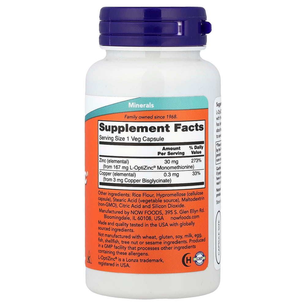 L-OptiZinc® 30 mg, NOW Foods, este o formulă premium cu zinc elemental 30 mg (273%) din L-OptiZinc® monometionină (167 mg), completată inteligent cu cupru bisglicinat 0,3 mg (33%) pentru menținerea unui raport nutrițional echilibrat. L-OptiZinc® este o formă chelatată unică, în care zincul este legat de L-metionină – un aminoacid esențial cu afinitate crescută pentru membranele celulare – ceea ce favorizează absorbția, retenția și biodisponibilitatea.