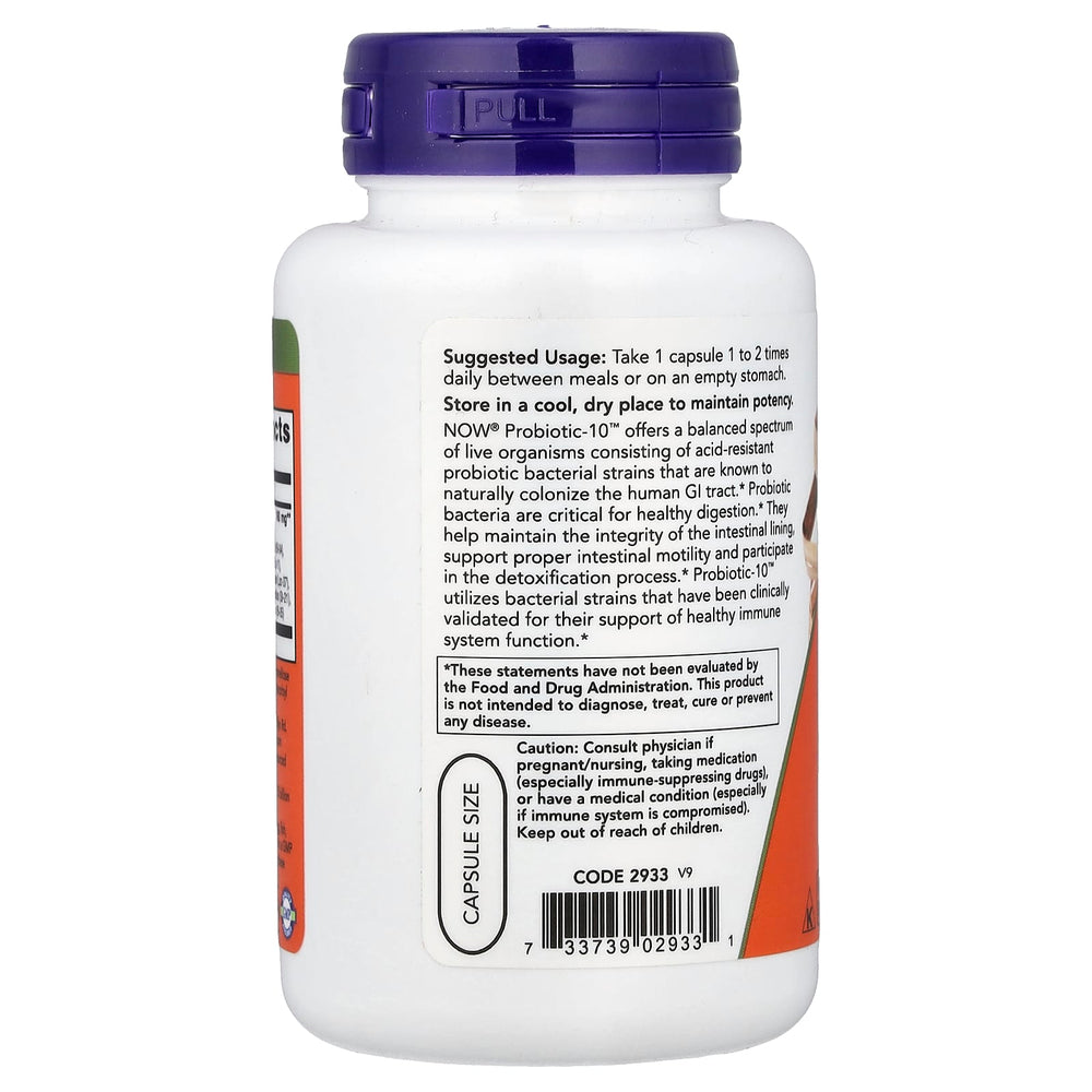 Probiotic-10 (Probiotice) 25 Billion, Now Foods este o formulă avansată creată pentru a susține diversitatea și stabilitatea microbiotei intestinale, imunitatea mucosală și confortul digestiv zilnic. Fiecare porție furnizează 25 miliarde CFU dintr-un amestec de 10 tulpini documentate, inclusiv Lactobacillus și Bifidobacterium, alături de Streptococcus thermophilus, selecționate pentru complementaritatea lor funcțională în tractul digestiv. Asocierea dintre tulpinile colonizatoare ale intestinului subțire și ale colonului oferă un spectru larg de acțiune: susținerea digestiei, producerea de metaboliți benefici (precum acizii grași cu lanț scurt), menținerea integrității barierei intestinale și sprijin pentru răspunsul imun fiziologic.