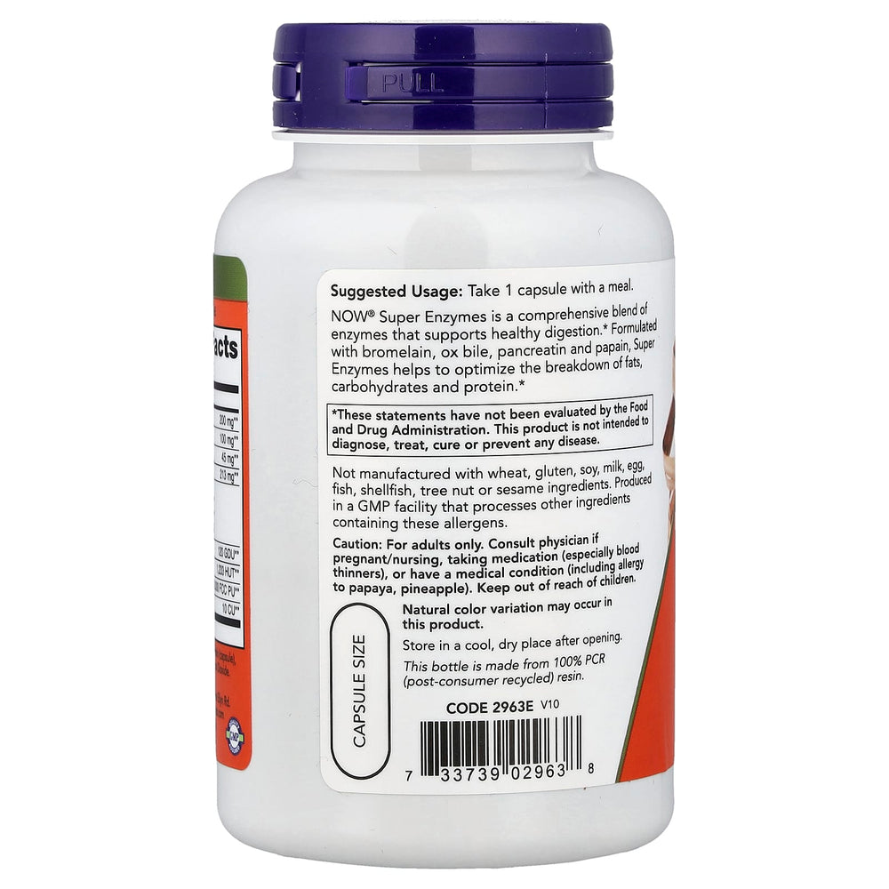 Super Enzymes (Enzime Digestive cu Spectru Larg), NOW Foods reunește Betaină HCl 200 mg, Extract de bilă 100 mg, Pancreatină 11X (amilază 37.000 USP, protează 37.000 USP, lipază 2.960 USP), bromelaină 120 GDU 40 mg, protează stabilă în acid 50 SAPU 10 mg, papaină 100.000 FCC PU 2 mg, celulază 10 CU 0,1 mg și pudră de papaya 45 mg într-o formulă completă, creată pentru digestie eficientă, confort abdominal și absorbție crescută a nutrienților – exact suportul pe care îl dorești pentru a te bucura de mâncare cu ușurință zi de zi.