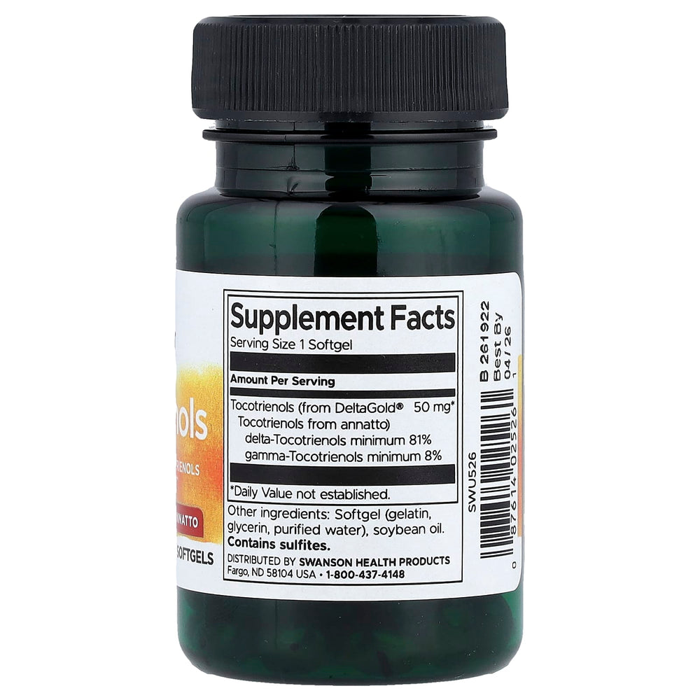 Tocotrienols from Annatto 50 mg, Swanson este un supliment premium formulat cu DeltaGold® Tocotrienols din annatto (Bixa orellana), o sursă naturală unică ce furnizează un profil concentrat de delta- și gamma-tocotrienoli. Fiecare capsulă conține 50 mg tocotrienoli, standardizați la minimum 81% δ-tocotrienoli și minimum 8% γ-tocotrienoli, oferind un spectru antioxidant puternic, cu rol în protecția membranelor celulare, optimizarea statusului lipidic și susținerea funcțiilor cardiovasculare. Tocotrienolii reprezintă membrii „rapizi” ai familiei vitaminei E, având o distribuție eficientă în țesuturi și o capacitate de a pătrunde în membranele celulare datorită lanțului lor izoprenic nesaturat. Prin această formulă, Swanson pune la dispoziție o doză precisă și reproductibilă, ușor de integrat în rutina de wellness.